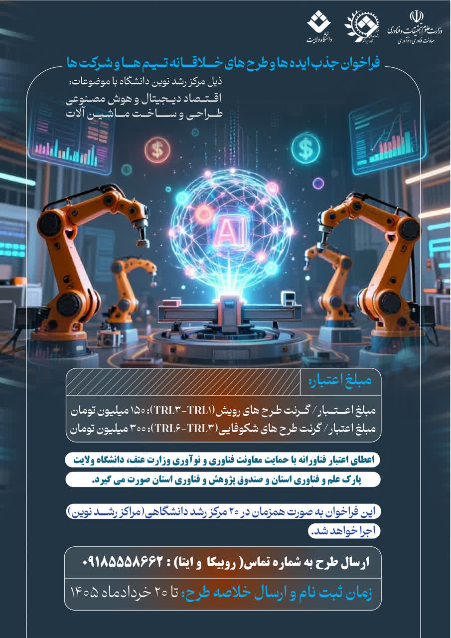 فراخوان جذب ایده های و طرح های خلاقانه تیم ها و شرکت ها ۰۷ اردیبهشت ۱۴۰۵ | ۰۹:۵۴ کد : ۲۸۱۷ اطلاعیه ارسال به دیگران نام شما ایمیل شما ایمیل دریافتکننده ارسال انصراف تعداد بازدید:۴